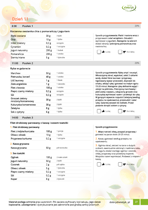 w formie propozycji posiłków (zamiast pojedynczych jadłospisów jednodniowych, przygotowano propozycje kilku propozycji dań na każdy posiłek). Tutaj nie uzależniamy Cię od tego jakie masz np. w danym dniu zjeść śniadanie czy obiad, tylko sam wybierasz sobie ulubione danie z kilku przedstawionych przez nas propozycji.