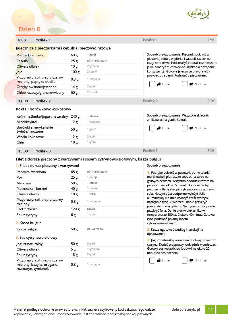 w formie propozycji posiłków (zamiast pojedynczych jadłospisów jednodniowych, przygotowano propozycje kilku propozycji dań na każdy posiłek). Tutaj nie uzależniamy Cię od tego jakie masz np. w danym dniu zjeść śniadanie czy obiad, tylko sam wybierasz sobie ulubione danie z kilku przedstawionych przez nas propozycji.