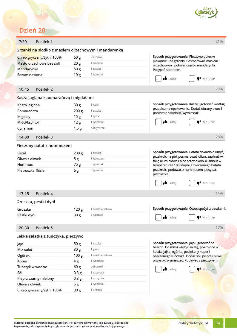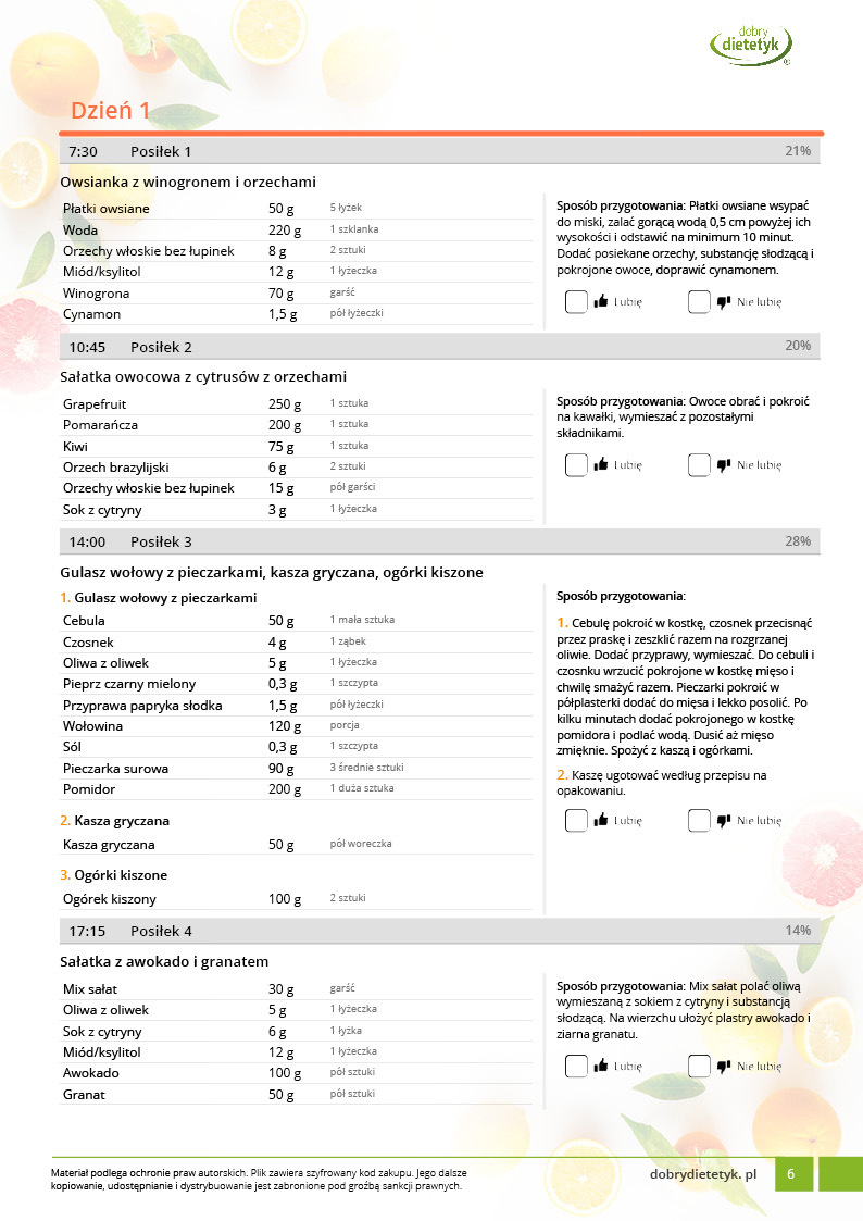• w formie precyzyjnych jadłospisów wielodniowych (na każdy dzień miesiąca jest opracowany osobny jadłospis). Tutaj nie musisz zastanawiać się co zjeść każdego dnia, gdyż będziesz mieć dokładnie wszystko rozplanowane.