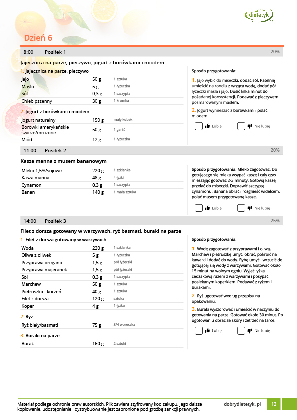 w formie propozycji posiłków (zamiast pojedynczych jadłospisów jednodniowych, przygotowano propozycje kilku propozycji dań na każdy posiłek). Tutaj nie uzależniamy Cię od tego jakie masz np. w danym dniu zjeść śniadanie czy obiad, tylko sam wybierasz sobie ulubione danie z kilku przedstawionych przez nas propozycji.