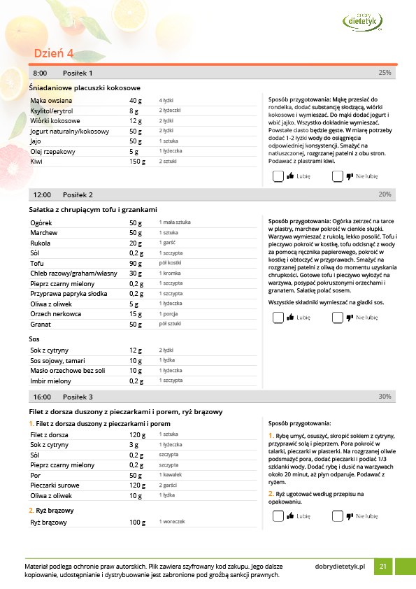 w formie propozycji posiłków (zamiast pojedynczych jadłospisów jednodniowych, przygotowano propozycje kilku propozycji dań na każdy posiłek). Tutaj nie uzależniamy Cię od tego jakie masz np. w danym dniu zjeść śniadanie czy obiad, tylko sam wybierasz sobie ulubione danie z kilku przedstawionych przez nas propozycji.