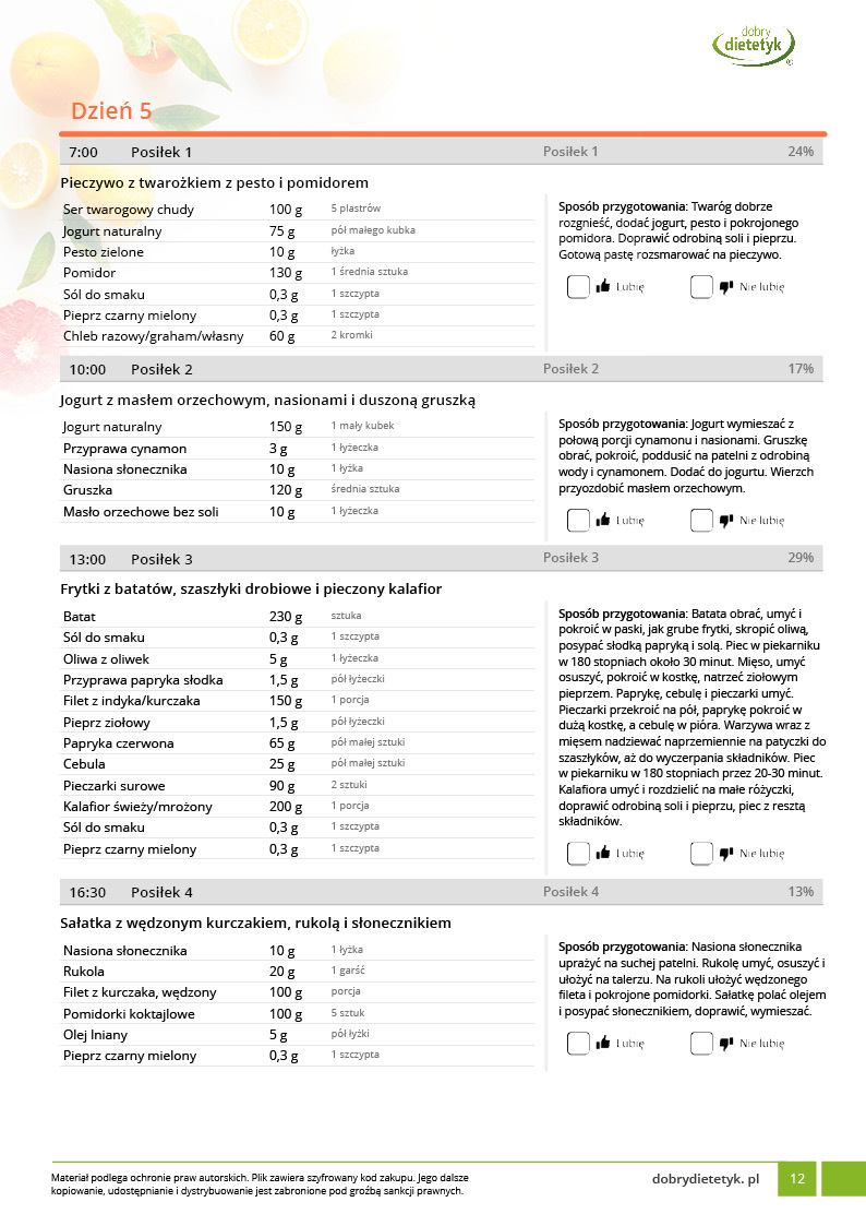 • w formie propozycji posiłków (zamiast pojedynczych jadłospisów jednodniowych, przygotowano propozycje kilku propozycji dań na każdy posiłek). Tutaj nie uzależniamy Cię od tego jakie masz np. w danym dniu zjeść śniadanie czy obiad, tylko sam wybierasz sobie ulubione danie z kilku przedstawionych przez nas propozycji.