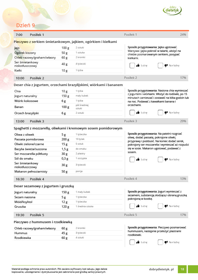 • w formie precyzyjnych jadłospisów wielodniowych (na każdy dzień miesiąca jest opracowany osobny jadłospis). Tutaj nie musisz zastanawiać się co zjeść każdego dnia, gdyż będziesz mieć dokładnie wszystko rozplanowane.
